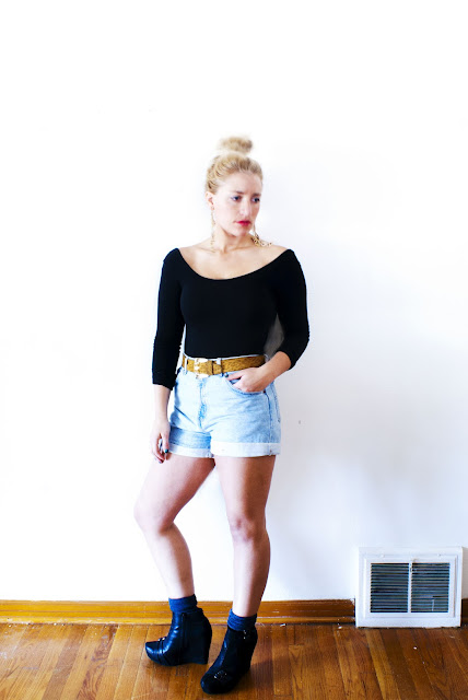 I love bodysuits, they are fantastic. You can wear them with pretty much anything and any way. I own quite a few of them, so I decided to take one of them today and put a little DIY spin on it. I cut it in the back to make it a deep scoop back to give it a little bit of a sassier and edgy touch. My favorite way to wear bodysuits is with high waisted shorts or pants. You can find them pretty much anywhere like www.americanapparel.com or www.Asos.com, (hint:if you are on a budget, you can also go to your nearest store like Target in the Children's dance section and get a plain ol' leotard, its the exact same).